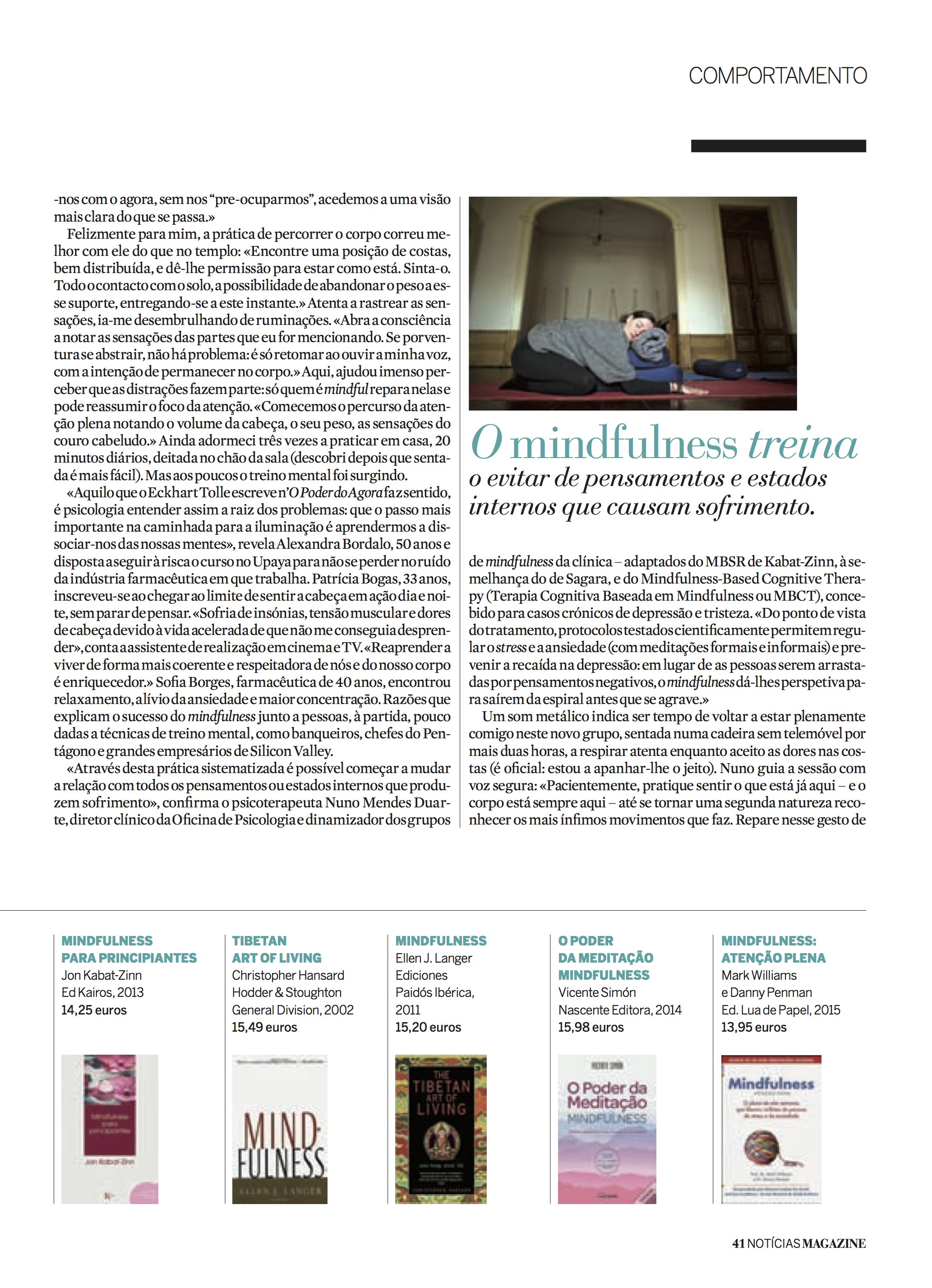 Dra. Carla Martins, diretora e fundadora do Ser Integral: Centro Português de Mindfulness é entrevistada para um artigo para a Notícias Magazine - O DESPERTAR DA MENTE. Ana Pago, jornalista da revista em questão, experiencia diretamente, uma sessão individual de mindfulness no Ser Integral.